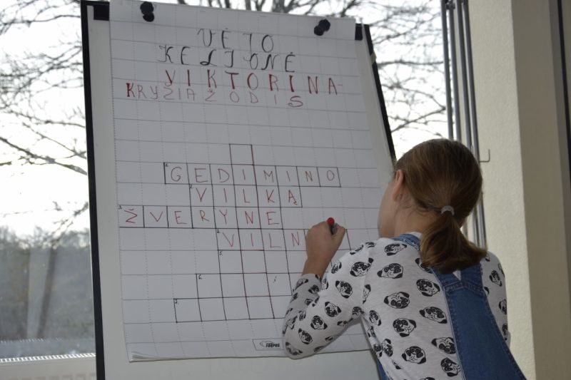 Skaityti ir klausytis eilėraščio „Vėjas Vilniuje“ reikėjo labai susikaupus. Kodėl? Todėl, kad dalyvių laukė atsakinga užduotis – kryžiažodis-viktorina „Vėjo kelionė“. Reikėjo sužinoti kur skrajojo vėjas. Tai dalyviai sužinojo teisingai atsakę į klausimus apie kunigaikščio sapną, kur nėra žvėrių, kokį miestą pastatė Gediminas ir dar kitus. Į kryžiažodžio langelius įrašę teisingus atsakymus perskaitė žodį „Vilniuje“. Atlikdami šią užduotį moksleiviai keliavo sostinės istorijos takais.