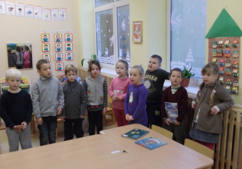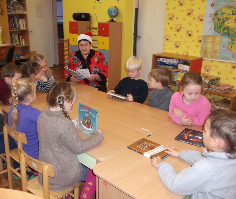 Bibliotekininkė palinkėjo vaikams džiaugsmingų Šventų Kalėdų ir įteikė kalėdinių dovanėlių, o vaikai atsidėkojo išmokta nauja kalėdine dainele.