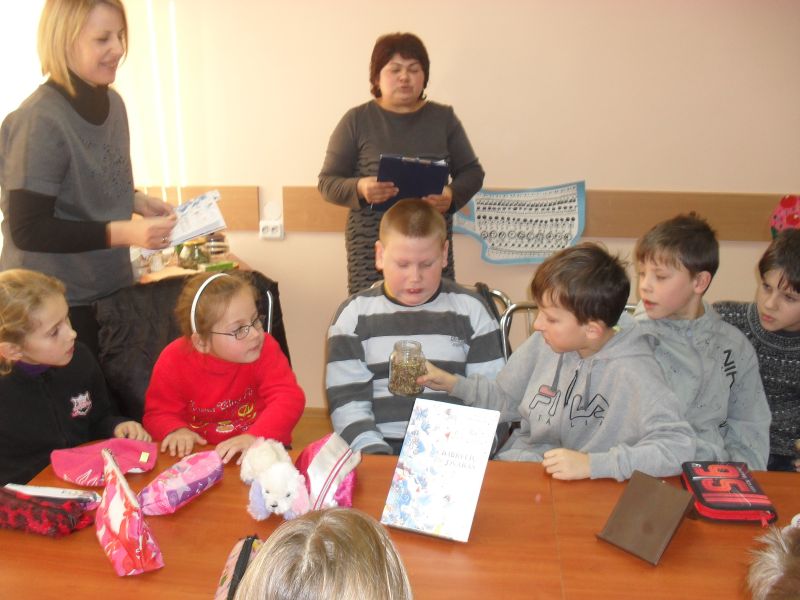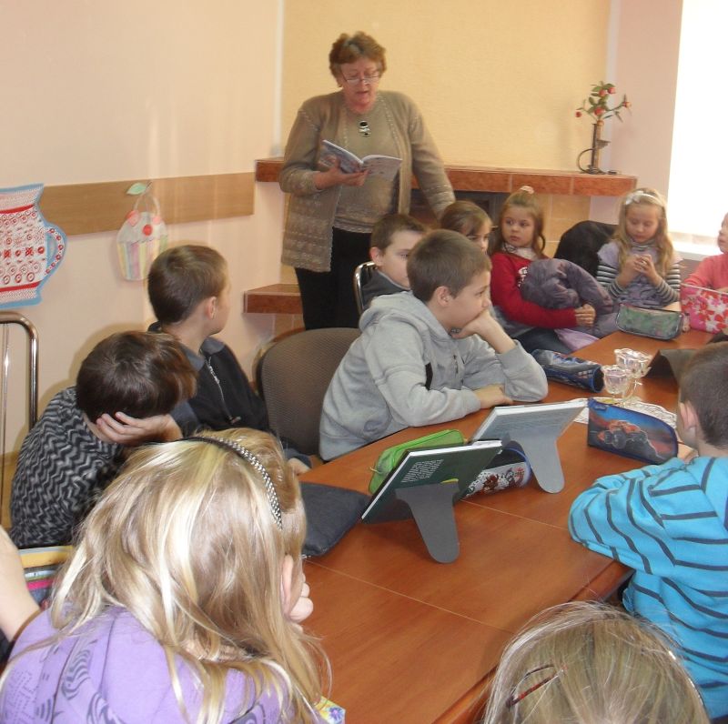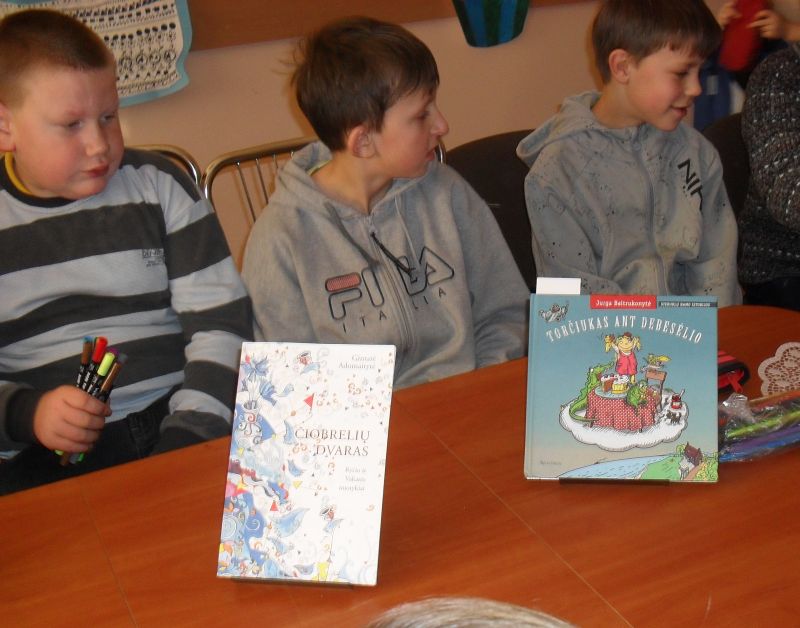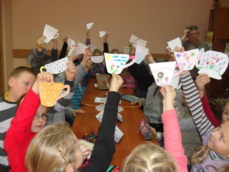 Jaunieji skaitytojai piešė puodelius. Teisingai atsakę į klausimus, buvo apdovanoti saldžiaisiais prizais. Išeidami 1-2 klasės mokinukai su mokytoja I. Strelkauskiene padovanojo kaimo bibliotekai knygų skirtukų, kad skaitytojai knygelių puslapių nelankstytų.