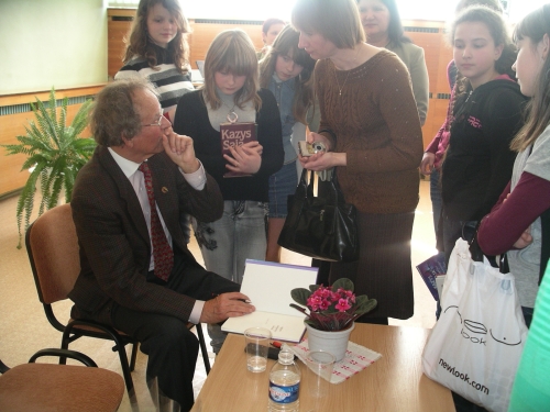 Apie rašytojo K. Sajos apsilankymą gimnazijoje primins bibliotekai padovanotos naujausios knygos su autografais, muziejaus svečių knygoje įrašyti prasmingi žodžiai.