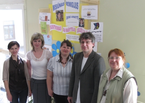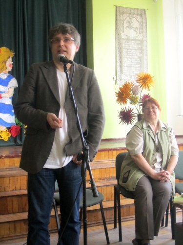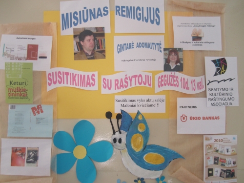 Nusprendėme, kad mūsų mokykloje lankysis rašytojas, socialinių mokslų daktaras, leidyklos „Bonus animus“ įkūrėjas Remigijus Misiūnas. Su nekantrumu ir šiokiu tokiu jauduliu laukėme „Sutrumpinto meilės terapijos kurso“ autoriaus, atvykstančio į mūsų mokyklą. Ir štai pagaliau sulaukėme! Gegužės 10-ąją rašytojas R. Misiūnas į susitikimą atvyko kartu su žurnaliste, prozininke, eseiste bei vaikų literatūros tyrinėtoja Gintare Adomaityte.