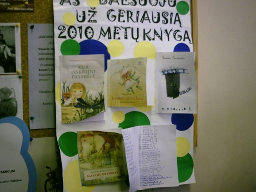 Sukūrėme plakatą, kuriame atsispindi visos penkios knygelės. Vaikas ant jam patikusios knygos plakate užrašė savo vardą, pavardę ir klasę. Mokytojos taip pat pabalsavo už joms patikusią knygą.