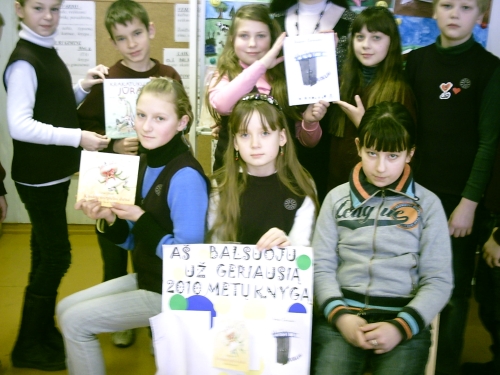Siunčiame keletą nuotraukų, kur 1 kl. mokiniai ir auklėtoja bei 4 kl. mokiniai jau pasirašę plakate už labiausiai patikusią knygą.
