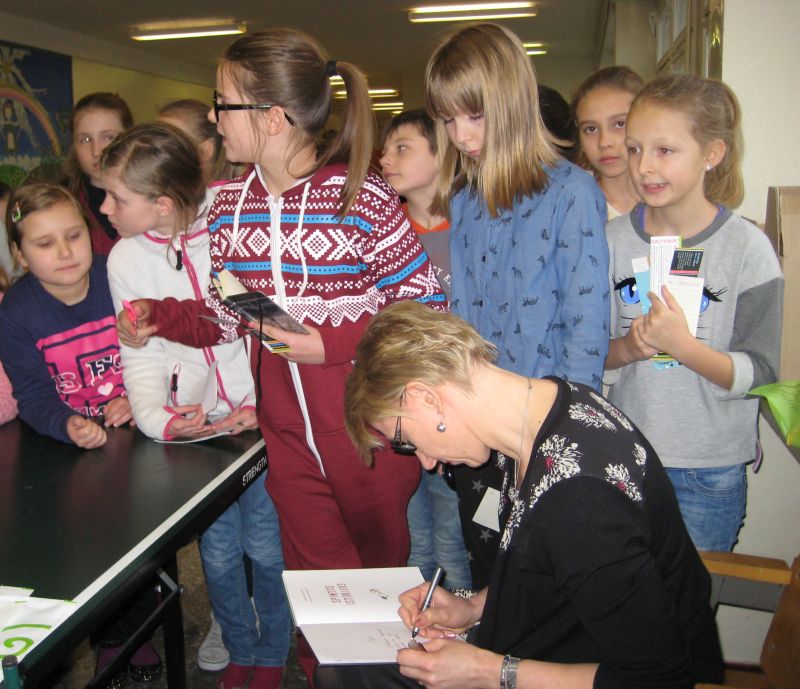 Renginio pabaigoje vaikai fotografavosi su rašytoja, stojo į eilę autografų, dalijosi Vaikų literatūros centro dovanotus knygų skirtukus.