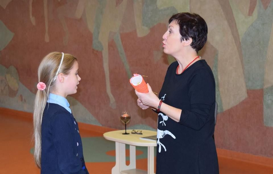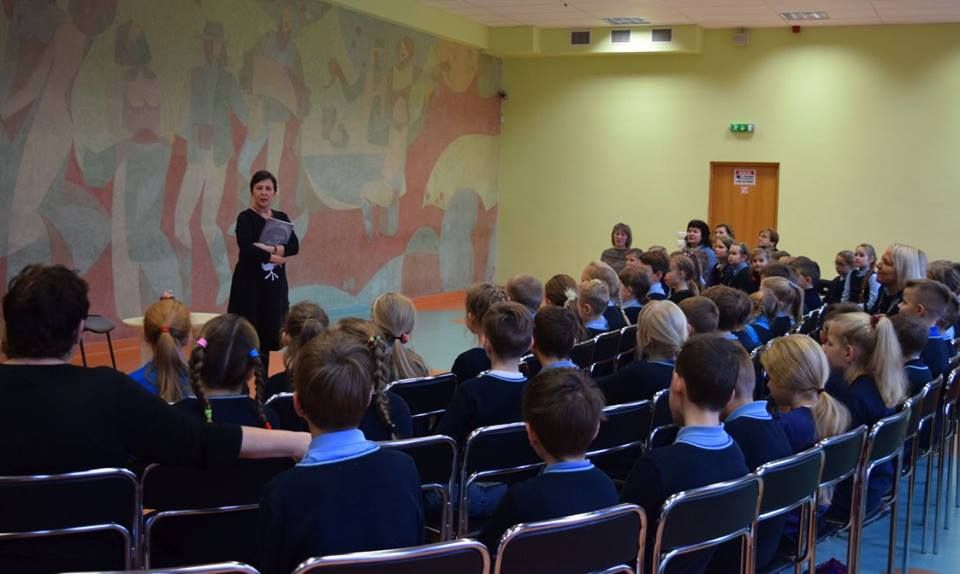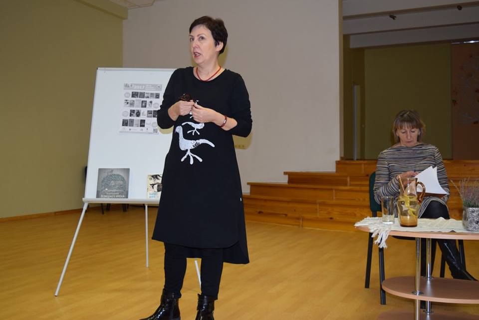 Po pietų rašytoja susitiko su „Atžalyno“ progimnazijos septintokais ir aštuntokais. Vyko improvizuota užklasinio skaitymo pamoka. Visi daug dirbo ir buvo puikiai pasiruošę. Moksleiviai Kristupas, Dominykas ir Martynas (mokytoja Irena Gatelienė) pristatė knygos autorę ir jos knygą „Sutikti eidą“, kuri laimėjo paauglių ir jaunimo literatūros konkursą, pelnė IBBY Lietuvos skyriaus skirtą Prano Mašioto premiją, šiais metais dalyvauja Metų knygos rinkimuose paauglių grupėje. Adrija ir Arvilė paskaitė ištrauką iš šios knygos. Rašytoja yra sakiusi: „Laikausi požiūrio, kad egzistuoja ne tik šita tikrovė arba, tiksliau sakant, kad ne viską, kas egzistuoja šioje tikrovėje, mes suvokiame.“ Kokią istoriją slepia tas paliktas ataušusios kavos puodelis? Norėdama tai išsiaiškinti knygos herojė Algė daug sužinos ir apie tai, kad išgalvota gali pasirodyti besą tikra. Kuris iš mūsų nenorėtų turėti atsidavusio draugo? Ar mums būtų svarbu iš kokio jis pasaulio?
