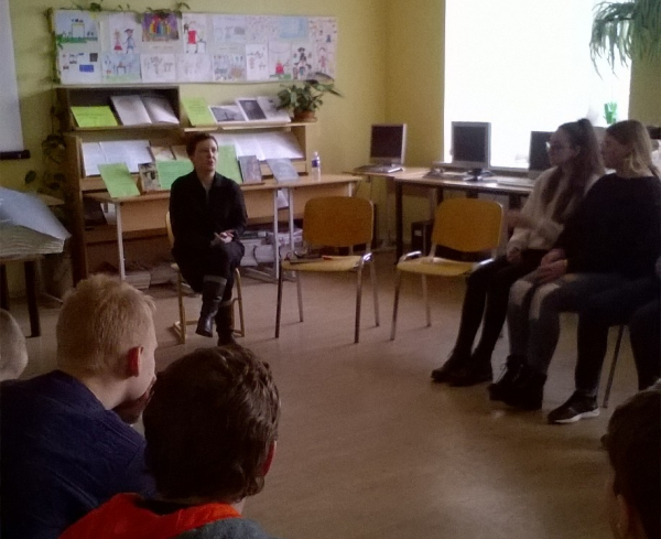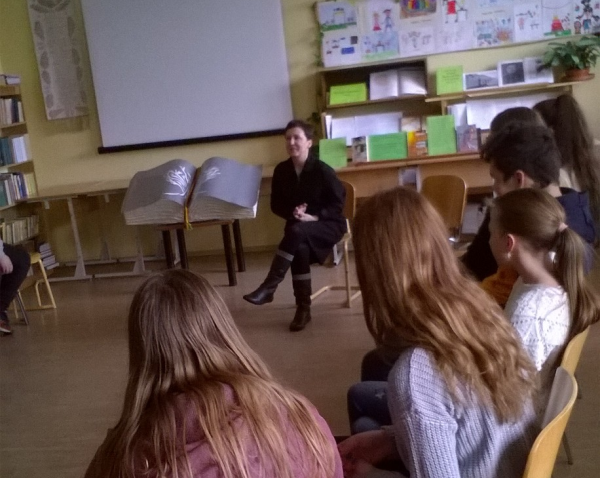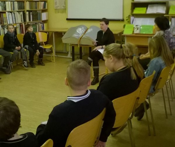 Viešnia pasakojo apie 2019-ųjų Metų knygų rinkimuose paaugliams atrinktas knygas, tarp jų – ir „Skiriama Rivai“. Bibliotekos kamerinėje aplinkoje Frederiko, Rivos, Alginos (Algyyynos, pravardžiuotos Angina), eido, Linos kitų draugė ir mama rašytoja Ilona bendravo su aštuntokais, šie – klausė jos patarimų, išgirdo atsakymus į dominančius klausimus.