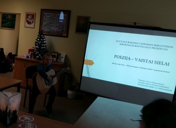 Įgyvendindami šį projektą, skaitome geriausią ir naujausią 2016 metų lietuvių poetų kūrybą, nes poezija yra puiki terapija sielai, padedanti atsikratyti negatyvių minčių. Gruodžio 20 dieną bibliotekoje prie arbatos puodelio vyko renginys – garsiniai poezijos skaitymai „Poezija – vaistai sielai“. Buvo pristatytas poezijos knygų penketukas: „Stuburo tik punktyrai“ (Eugenijus Ališanka), „Roma“ (Mantas Balakauskas), „Giedanti gaidžio galva“ (Stasys Eidrigevičius), „Adatos“ (Dainius Gintalas) ir „Singerstraum“ (Giedrė Kazlauskaitė). Poetinį žodį keitė Alytaus rajono meno ir sporto mokyklos Krokialaukio skyriaus mokinių Julijos Mikolaitytės, Brigitos Maske liūnaitės ir Lauros Pavilonytės (mok. G. Pikūnas) gitaromis atliekami valsai.