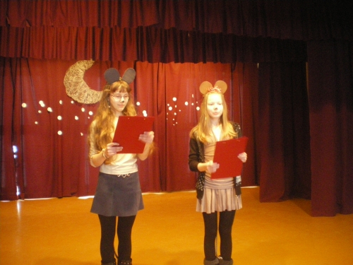 Sausio 28 d. dvi mūsų gimnazijos bibliotekoje gyvenančios pelytės Evelina ir Lina kvietė pradinukus ir jų tėvelius į aktų salės sceną, kad pasidalytų savo įspūdžiais apie perskaitytas knygas.