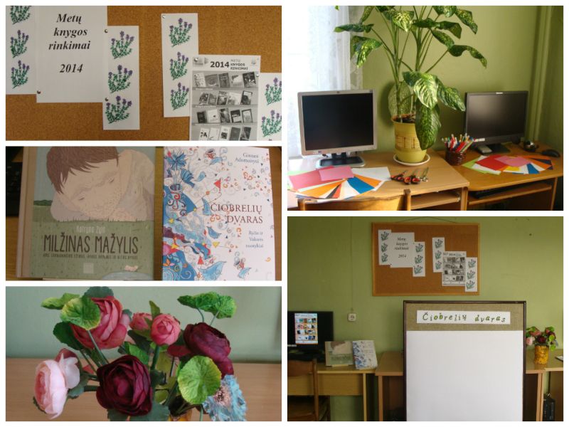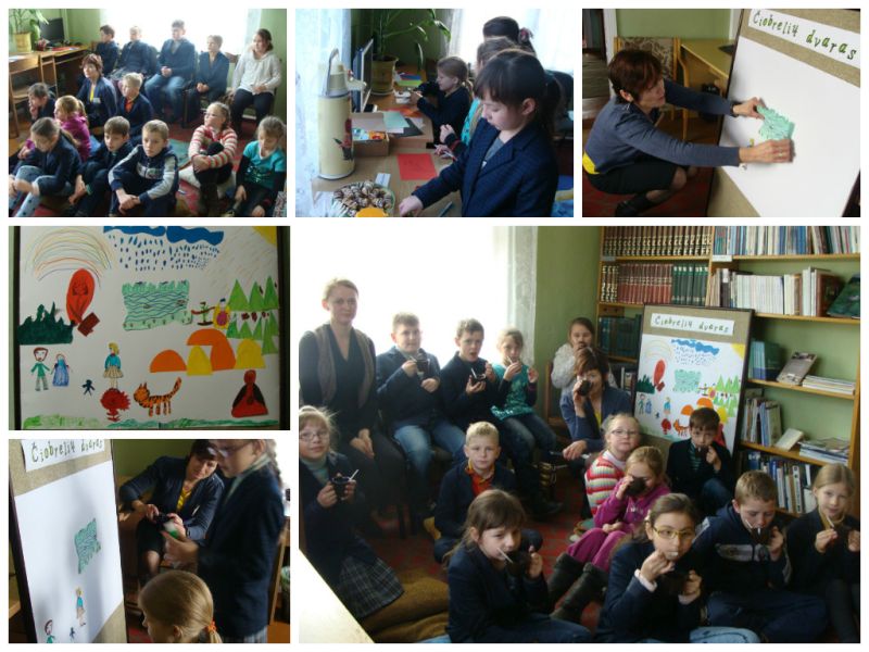Patogiai įsitaisę, vaikai klausėsi ištraukų iš minėtos knygos. Prieš tai kiekvienas buvo gavęs kortelę su užduotimi. Bibliotekininkei Arinai baigus skaityti, mokinukai atliko savo užduotis: vienas turėjo nupiešti katinę Rainę, kitas iškirpti debesis su lietaus lašeliais, kaip išmanydami vaikai pavaizdavo Mėlynių princesę, Žemuogių karalienę, Čiobrelių dvaro kavalierių. Visa tai suklijavę ant didelio lapo, gavome gražų čiobrelių dvaro peizažą.