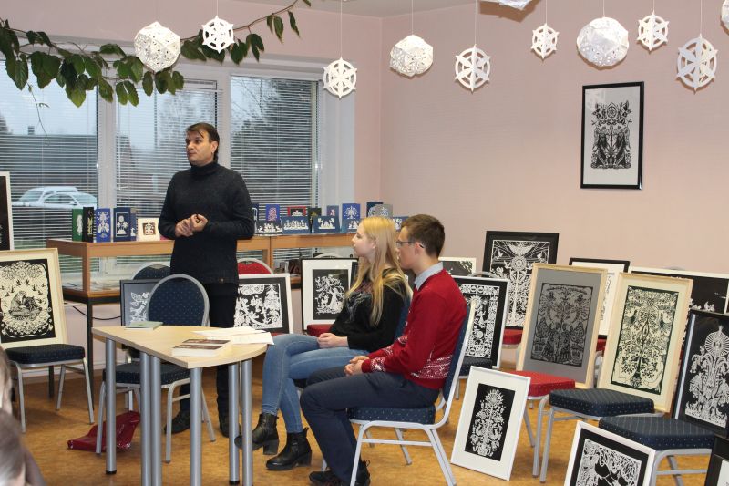 Susitikimui einant į pabaigą, rašytojas išsakė savo požiūrį į lietuvių kalbos valstybinio brandos egzamino programos pataisas, o tautodailininkė R. Slesoriūnienė pristatė savo karpinių ir atvirukų parodą, šiuo metu eksponuojamą Utenos Adolfo Šapokos gimnazijos bibliotekos skaitykloje. Tautodailininkė apibūdino savo kūrinius, aptarė jų atsiradimo istorijas, parodė mokiniams savo darbo įrankius bei nupiešė kelių mokinių portretus.