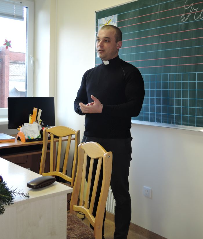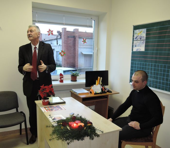 Renginį vedė mokyklos direktoriaus pavaduotoja ugdymui Daiva Bušmienė. Supažindino dalyvius su Metų knygų rinkimų akcija, galimybe balsuoti ir rinkti labiausiai patikusią knygą; pristatė svečią – Palangos Švč. Mergelės Marijos ėmimo į dangų parapijos kunigą Romą Starkutį. Jis papasakojo apie advento ir Kūčių tradicijas, istoriją, šventų Kalėdų švenčių prasmę, reikšmę; pakalbėjo apie savo pomėgį – skaitymą, studijas.