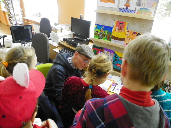 Susitikimą nutarėme organizuoti po mūsų gimnazijos stogu įsikūrusioje Dusetų viešojoje bibliotekoje. Su jos darbuotojomis glaudžiai ir sėkmingai bendradarbiaujame jau daugelį metų. Ir šį kartą mes čia buvome laukiami: paruoštas ekranas, eksponuojami vaikų piešiniai.